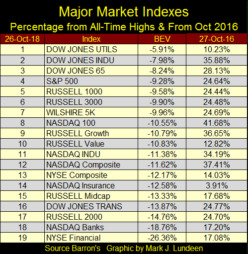 Here’s a table listing how the major market indexes I follow are doing. The BEV column shows the percentage declines from their last all-time highs, and the 27-Oct-16 column gives their percentage advances in the past two years, or how much of the amazing President Trump’s post-election market advance they have retained at week’s end.