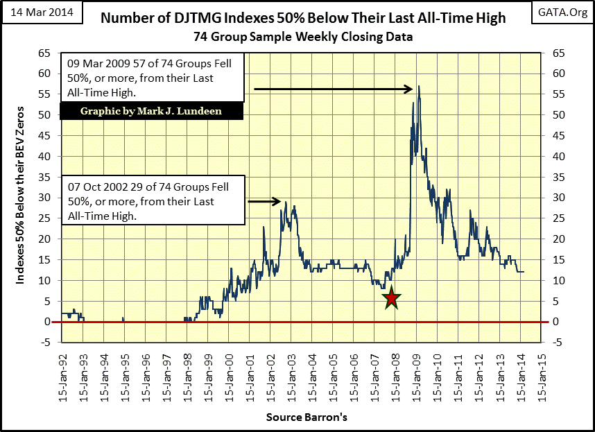 The decline of March 2009 would have been much deeper had the US Government not decided to bail out the banks with trillions of dollars of monetary inflation, something they continue to do to this day with their QE program.  However the best laid plans of mice and our monetary authorities seldom end as planned.   With 50 of the DJTMG indexes currently within 20% of an all-time high (chart above), and the Federal Reserve continuing to taper its QE, we may be approaching the time when the stock market once again begins to decline.   How bad could the decline bePotentially disastrous as shown in my next chart plotting how many of the DJTMGs have declined 50% or more from their all-time highs.