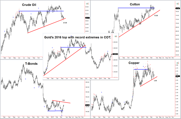 The Copper, Cotton and Crude Oil markets have recently registered COT numbers at multi-year extremes. The prices subsequently broke out to new highs, but failed to gain any traction. This is similar to what was seen in gold price last summer. A violation of the support lines will likely result in a domino of selling pressure.