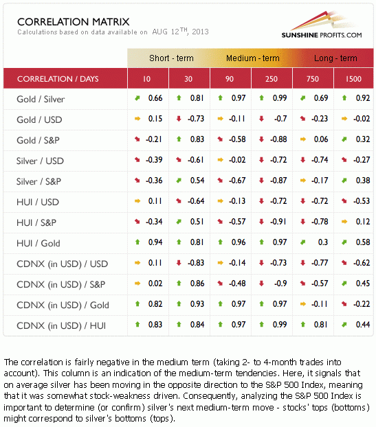 Will this inverse very short-term relationship between the general stock market and silver last longer? After all, on average silver used to move in the opposite direction to what the stock market was doing – taking medium-term moves into account. Let’s take a look at the Correlation Matrix for more details.
