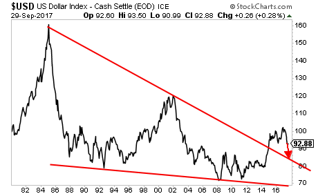 The $USD has already caught on to this, having dropped 10%. And the long-term chart is even uglier.