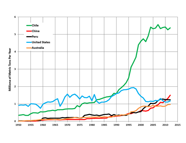 Production trends in the top five copper-producing nations (dominated by Chile)