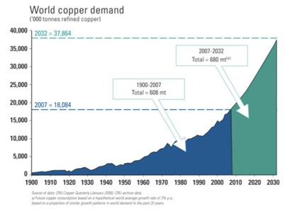 - Global Growth in copper demand is relentless based upon historical data since 1900 (*)