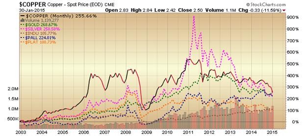 For centuries Copper has always been considered an Industrial Metal. However, since the dawn of 2003 the price performance of Copper has indeed competed neck and neck with Gold and Silver price appreciation…and has literally left Wall Street stocks nearly dead in the toilet water. The following chart shows the appreciation of Copper, Gold, Silver and the DOW Stock Index during the past 12 years (as of January 26, 2015).