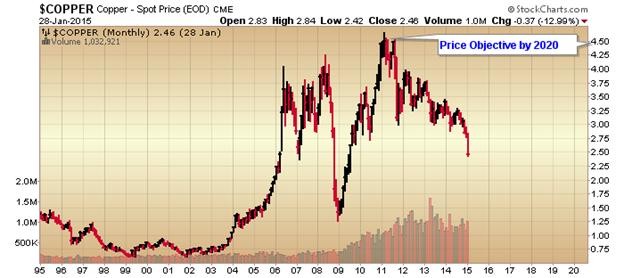 The basic assumption to estimate Copper’s price 5-years from now (2020) is premised on its Compound Annual Growth Rate (CAGR) from 2003 to date (2015). To be sure Copper’s price appreciation from 2003-2015 shows a CAGR of 10.5%. Therefore, projecting this yearly appreciation for the next 5-years (to 2020) the price of Red Gold should (again) reach its all-time record high of $4.50 (forged in early 2011)…sometime during the next five years.