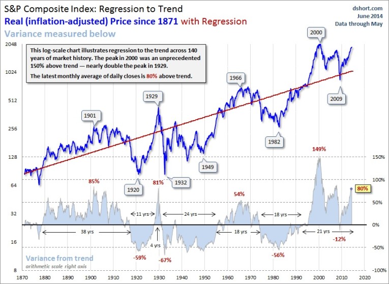 The peak in 2000 marked an unprecedented 150% overshooting of the trend — nearly double the overshoot in 1929. The index had been above trend for two decades, with one exception: it dipped about 12% below trend briefly in March of 2009. But at the beginning of May 2014, it is 78% above trend, down from 80% above trend the month before. In sharp contrast, the major troughs of the past saw declines in excess of 50% below the trend. If the current S&P 500 were sitting squarely on the regression, it would be around the 1046 level. If the index should decline over the next few years to a level comparable to previous major bottoms, it would fall to the vicinity of 500.