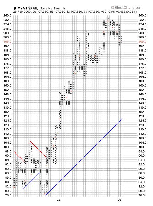 Note how its "relative" price has broken up from a double top. This is important in that Newmont has been a relative under-performer as compared with (say) Harmony or Durban Roodepoort Deep