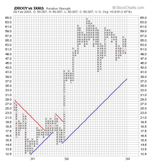 Notice how far away HMY's chart is from its trendline, and how far DROOY is from its trendline. This tells me that if the Primary (or Secondary) Trend of the $XAU should change, shareholders in both Harmony and DROOY will be at significant risk.