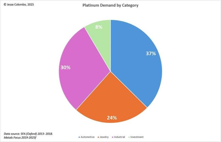 Unlike gold and silver—which have long histories as monetary metals used in coinage, currency backing, and investment—platinum was only discovered and understood relatively recently, in the 18th century. It has seen virtually no use as money, and only about 8% of its demand comes from investment. The remaining 92% is driven by other applications: automotive catalytic converters (37%), industrial uses (30%), and jewelry (24%), as illustrated in the pie chart below.