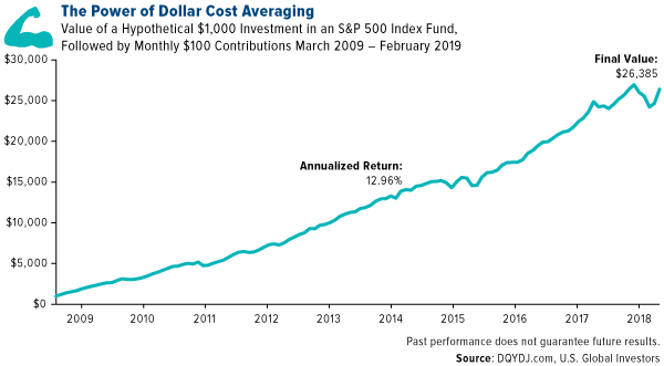 I’ve shared this chart with you before, but I think it’s worth sharing again. It shows a hypothetical initial investment of $1,000 in an S&P 500 Index fund in March 2009. Ten years later, after regular monthly contributions of only $100, the value of that initial investment grew at an annualized 12.96 percent to more than $26,385. Investors who had the discipline to stick with this plan and reinvest the dividends were rewarded handsomely.