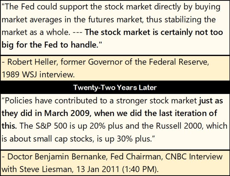 When in October 2008 that proved to be insufficient, in a panic, Congress on live commercial-free TV gave the Federal Reserve “new tools”, including a monetary “bazooka” to “stabilize market valuations.”
