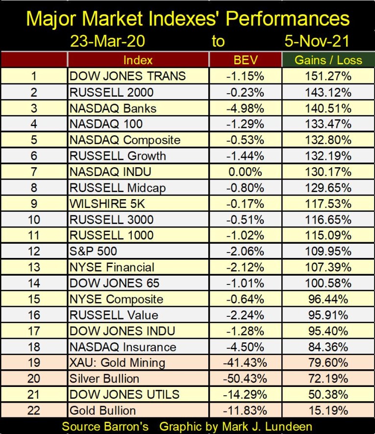 Looking at the performance for the precious metal assets in the right table above, they continue outperforming the broad stock market. Each closing the week in the top five of twenty-two, with gold leading the pack at #1. Quite a change from where these indexes were at on 05 November 2021, in the table below, which then used the lows of 23 March 2020, the bottom of the 2020 flash crash as a basis.