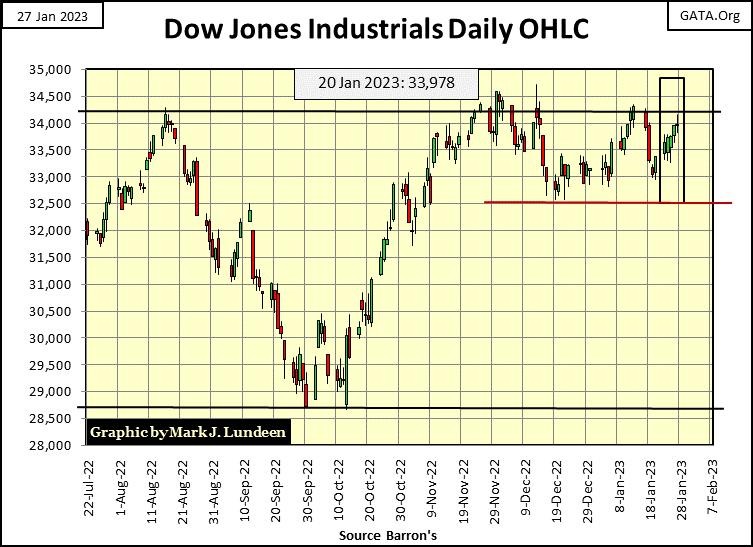 Up where I’m sitting, high above the playing fields in the market’s peanut gallery, we’re betting beer and hotdogs on what the Dow Jones is going to do next; close above 34,250 or below 32,500. I have a beer on its first breaking below 32,500. I’m probably wrong, but heck its only beer. Time will tell if I’m wrong or right.