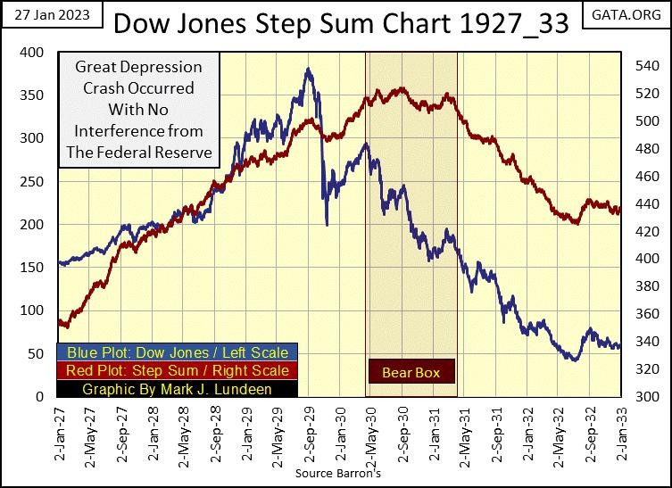 Something happened here, but what? The following is only my theory of the Great Depression Market Crash, as seen in the Dow Jones’ step sum chart below, but here it is.