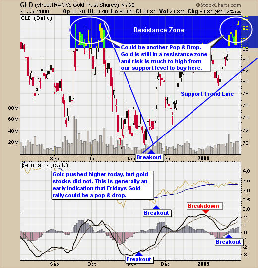 Gold stocks have been struggling to move higher and last Friday gold made a nice move higher while gold stocks sold down. My last article talked about how trading gold (GLD) may be a better investment then gold stocks right now simply because of the bearish broad market. The broad market looks like it's about to make another leg lower and when the broad market sells off, it pulls all stocks with it. The daily chart of the HUI Gold Bugs Index shows precious metal stocks moving sideways while gold pushed higher. When gold stocks start to underperform the price of gold I tighten my stops and mentally prepare myself for gold to pull back. The smart money always seems to move in and out of stocks faster than the commodity which is a topic I mentioned in a previous report as well.