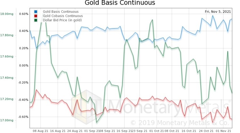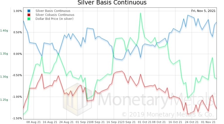 Since early August, the price of gold has gone nowhere, and the price of silver has dropped about $1, or about 4%. With each gyration on these paths, the cobasis (our measures of scarcity, respectively) has moved inversely to the price of metal, in dollar terms.