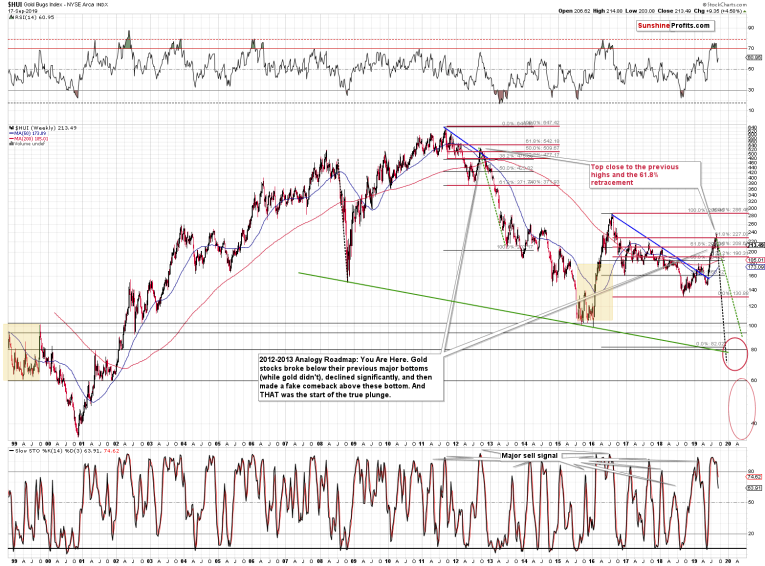 The similarity between now and 1996 extends to silver and mining stocks – in other words, it goes beyond USD, gold-USD link, and gold itself. The white metal and its miners appear to be in a similar position as well, and the implications are particularly bearish for the miners. After their 1996 top, they erased more than 2/3rds of their prices.