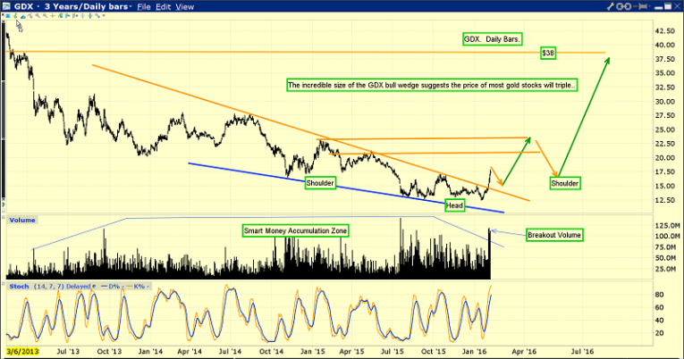 Now it appears that GDX is forming a large inverse head and shoulders bottom pattern, much bigger than the one taking shape on the bullion chart.