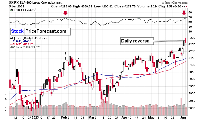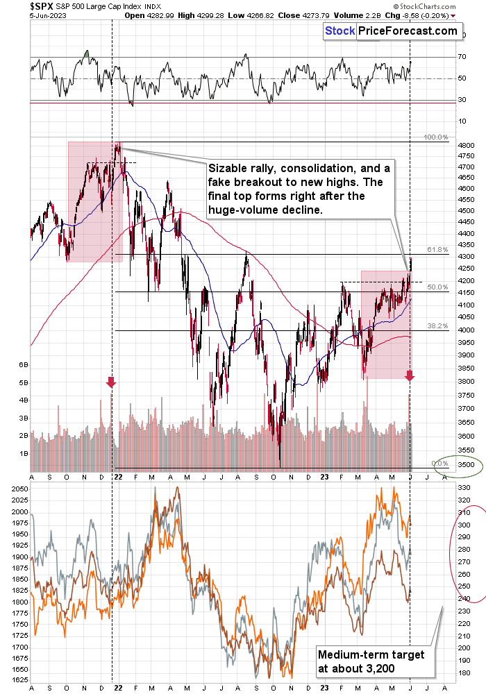 The debt-ceiling deal rally took stocks to new highs, and they are about to encounter a very strong resistance in the form of the mid-2022 high. This level is likely to hold due to the part of the cycle in which the market is most likely in (“return to normalcy”), and also due to the analogy to the previous situation when stocks first declined on huge volume and then rallied to new highs.