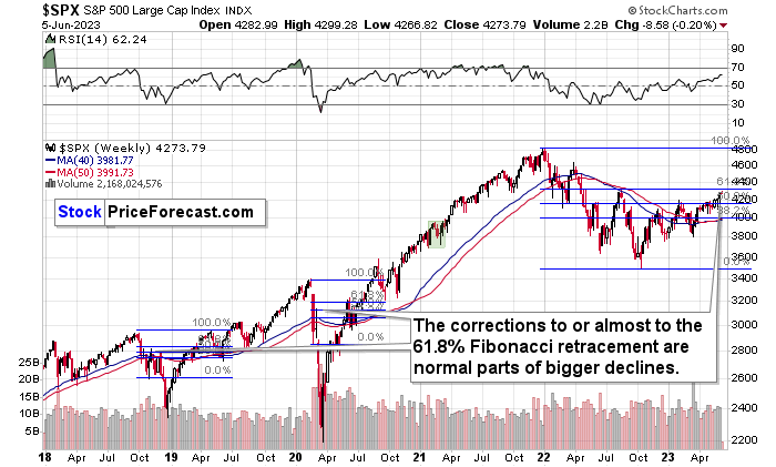 Now, the above-mentioned 50% is obviously not 61.8%, but it does confirm the point that Fibonacci retracements are important resistance levels for stocks in general. And since stocks are already above their 50% retracement and they just moved very close to their 61.8% retracement, the odds are that the top is in or at hand.