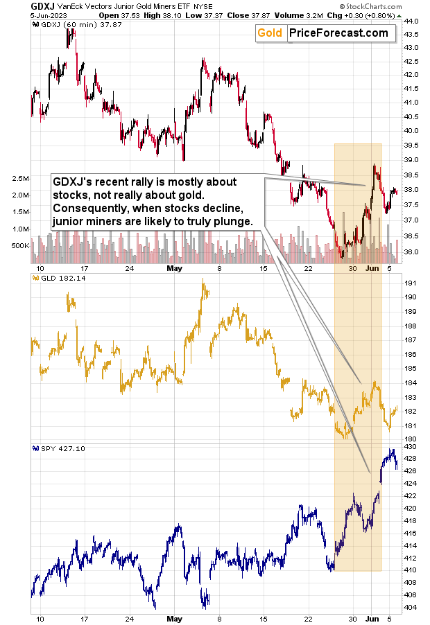 GLD moved higher recently, but not THAT high. Stocks (SPY) on the other hand, rallied sharply recently. Just like junior miners did. Juniors’ rally was just a verification of the breakdown below the early-May low, but still, it was quite sharp – just like what we saw in stocks.