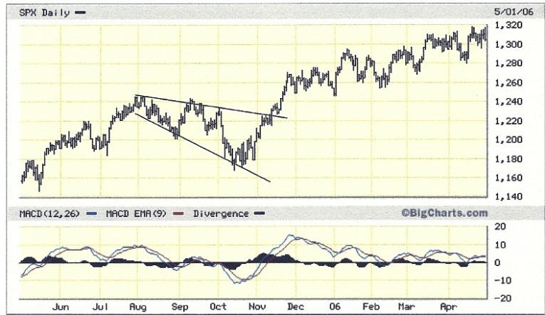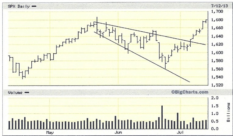 The story of the week was the new high in the S&P 500 Index (SPX). The comeback of the SPX was remarkably fast, though this isn’t unusual given the historical tendency for the “megaphone” chart pattern visible in the index to bounce back quickly. Traders may remember a similar megaphone pattern in the SPX from the year 2005; like the current pattern, the megaphone of 2005 had a quick and violent turnaround (see chart below).