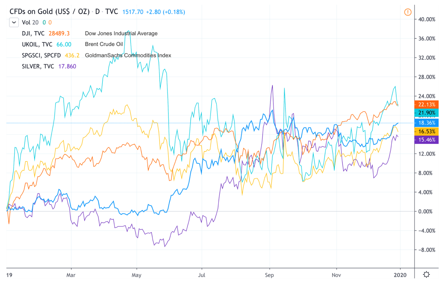 It was a very good year for precious metals. Gold posted a nearly 19% gain and silver rose over 17%. As you can see in the chart below, the move higher began in early summer defying the annual summer doldrums, hit an impasse during autumn, then ended the year with a surprise Santa Claus rally that took it over the $1520 mark. Silver pushed briefly over the $18 mark in late December then settled at $17.78. Bloomberg Intelligence’s Mike McGlone offers a hopeful tone for our favorite precious metal as 2020 begins: