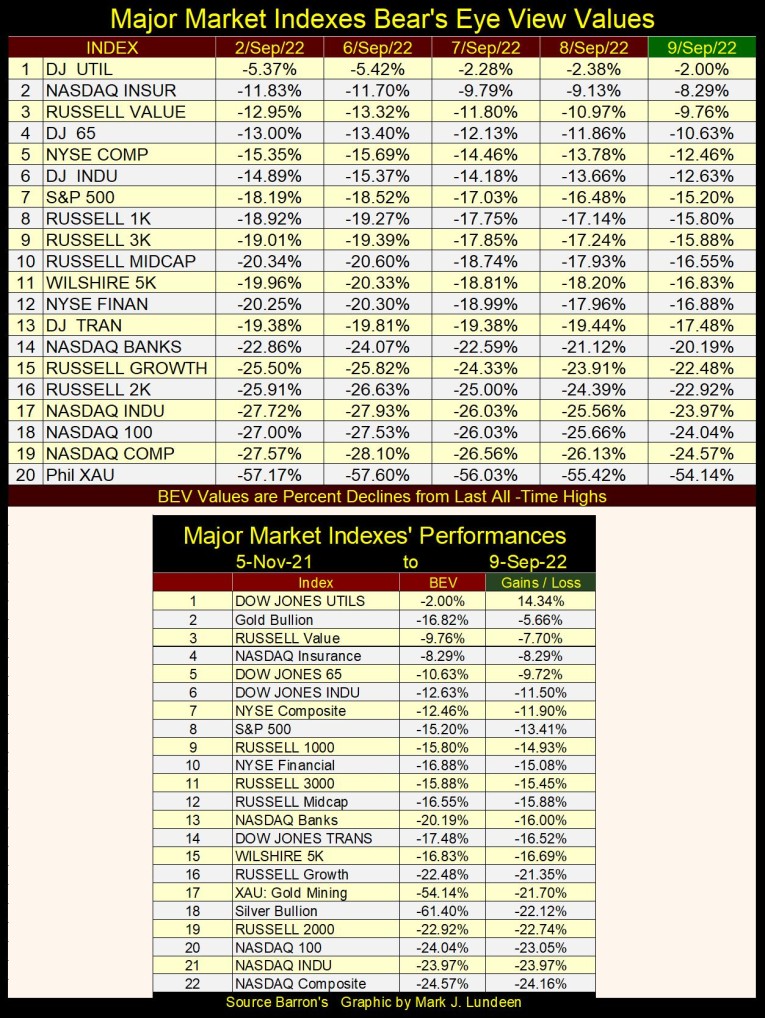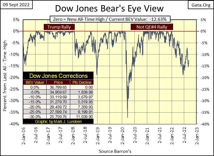 This week the Dow Jones lifted up a bit from its BEV -15% line, closing with a BEV of -12.63%. What exactly does that mean? In a BEV plot, all new all-time highs are reduced to a 0.00%, and never more at the Red BEV Zero (0.0%) line. Any daily closing in the BEV chart below, that are not a new all-time high, registers as a percent claw-back from their last BEV Zero (last all-time high). So, this week, the Dow Jones closed 12.63% from its last all-time high, which occurred last January 4th.