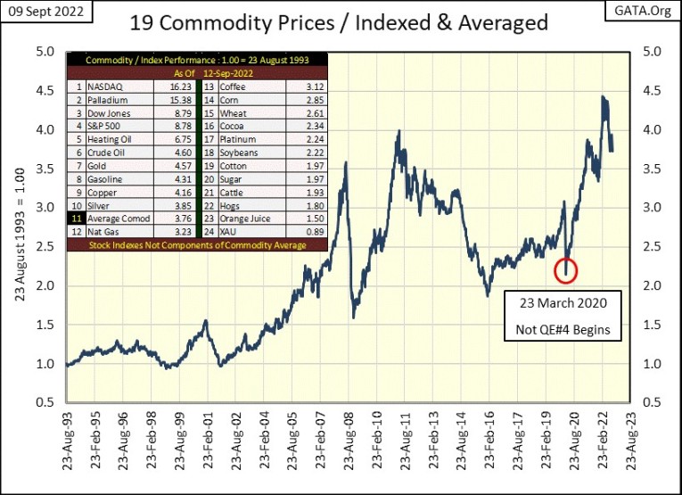 Here is my chart plotting the averaged indexed values to the nineteen commodities I follow weekly. It’s obvious Fed Chairman Powell’s Not QE#4 in March 2020 instigated the latest bout of consumer price inflation. This surge in consumer prices peaked last February, and in the last seven months has seen a retracement.