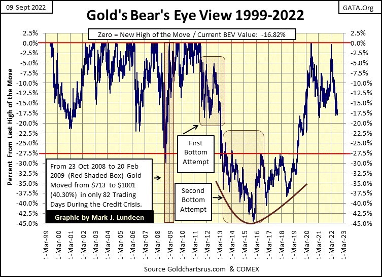 Gold is a volatile market. When gold began its current advance in July 1999, it regularly saw 20% plus corrections up to its BEV Zero of August 2011. Just before the bottom fell out of the gold market in September 2011; gold had increased from $253.70 on 19 July 1999, to $1888.70 on 22 August 2011. A twelve-year, 644% advance, during which were seen corrections as deep as 30% in October 2008.