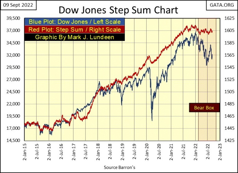 These step sum chart formations are called bear-boxes, as they are places where bulls get punished for being wrong on the market. We’ll know if that is to be should the Dow Jones’ price plot resume its bearish ways, as the bulls pent up selling results in the step sum plot recoupling with the price plot to the downside in the chart below.