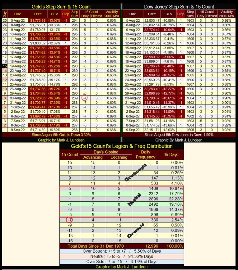 In the frequency table above, showing the daily frequency of gold’s 15-count closing between a range spanning from +15 to -15, gold closed with a 15-count of -7 for only 330 days of its 12,996 daily closings since 31 December 1970. Gold could now sell off until its 15-count decreases to a -9, but since 1970, that hasn’t happened too many times. And as we see, this week the gold market closed with a 15-count of -3.