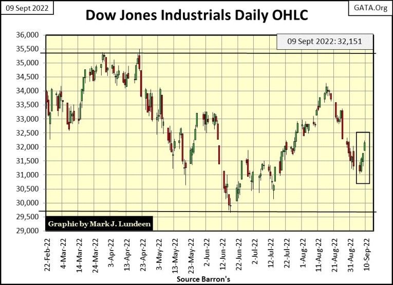 The smaller Red Circle marks the bottom of the March 2020 flash crash. The rebound in the Dow Jones off that bottom tells us how radical Fed Chairman Powell’s Not QE #4 was, pushing the Dow Jones to its last all-time high of 36,799 seen on January 4th of this year. In March 2020, had the Not QE #4 not been implemented, where would the Dow Jones be today? I’m thinking far below where it was in March 2020!