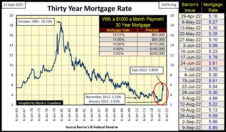 Mortgage rates too continue rising, chart below. Since January 2021, where mortgage rates saw a forty year low (2.65%), this week they increased to 5.89%, a thirteen year high. What’s next? Are mortgage rates at a top, or will they continue rising from these levels?