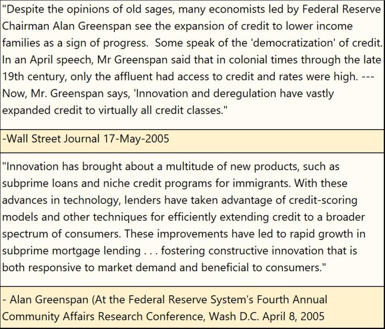 But then Wall Street began finding ways to maximize their profits in the mortgage market, and “politically correct” (aka Woke) politicians began decrying how the poor in America’s inner cities were being left out of the then housing bull-market. As the housing market is a heavily “government-regulated” market, and Wall Street discovered ways to “spread market risks to those best able to bare them”, via the then newly devised derivatives, it was decided by the powers-that-be, that allowing the chronically unemployed access to a $250K mortgage was an acceptable risk.