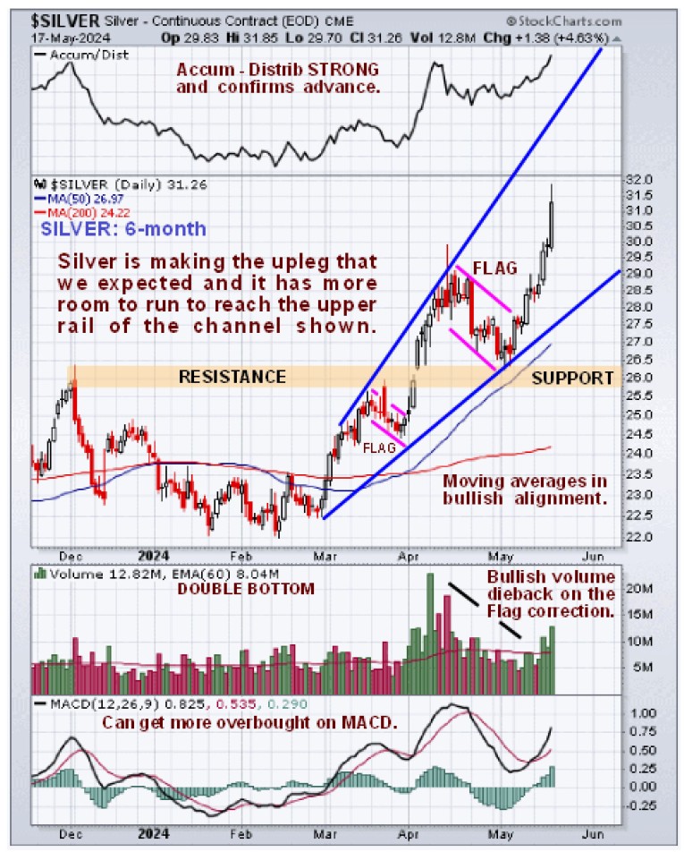 Silver, however, showed no such hesistancy and broke out of its bull Flag and raced ahead, clearing the important psychological $30 barrier almost as if wasn’t there and as we can see on its 6-month chart it looks set for further gains as it has a ways to go before it reaches the upper rail of its uptrend channel. We correctly anticiated this development and bought a raft of 6 SILVER STOCKS POISED TO ADVANCE about a week ago, all of which are up, some substantially like Dolly Varden.