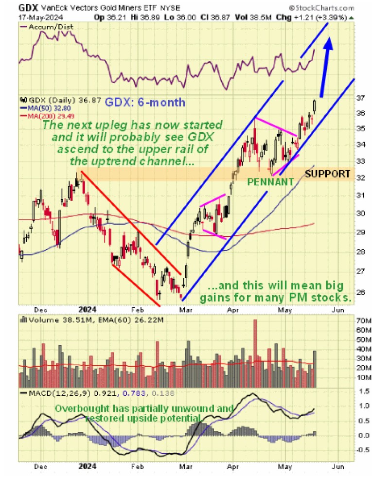 PM stocks meanwhile continued to forge ahead, especially on Friday, building on the breakout from the bull Pennant of 9th May as we can see on the 6-month chart for sector proxy GDX which shows that they have plenty more upside before they arrive at the upper rail of their uptrend channel…