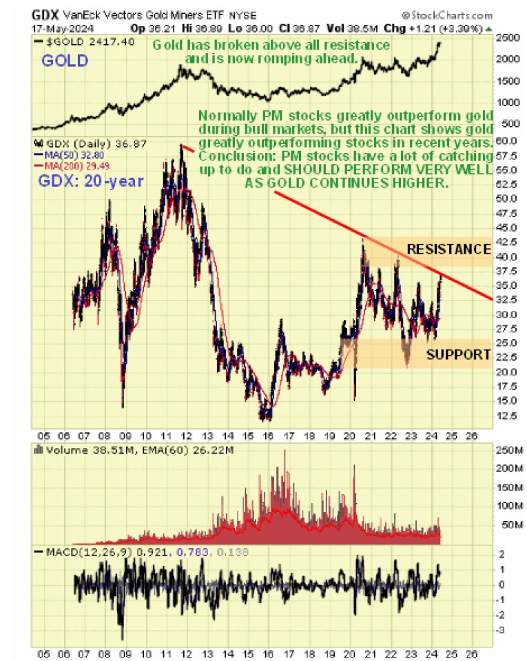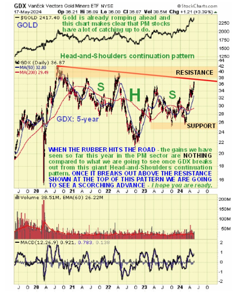 The 20-year chart for GDX is most interesting as it shows very clearly why the PM sector has such huge upside from here. One is that GDX is still way below its 2011 highs and this despite gold having made clear new highs. Gold is shown at the top of this chart and we see that it is romping ahead with a now very big positive divergence relative to PM stocks. This isn’t the way it is supposed to be - traditionally during sector bullmarkets stocks way outperform bullion for the obvious reason that with their high fixed costs mines become vastly more profitable as gold continues to appreciate. What this means is that PM stocks have a lot of catching up to do – and the more gold (and silver) ascend, the more catching up there will be to do. This is why PM stocks are expected to rip higher once GDX overcomes the resistance shown on this chart, and the 5-year earlier.