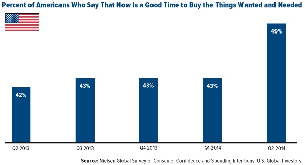 As you can see in the chart below, there’s a 17 percent increase from the same time a year ago in American respondents who feel that now is a good time to spend their money on necessary and discretionary goods and services.