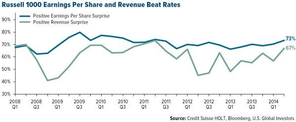 It’s earnings season once again, and though only a quarter of the Russell 1000 has reported so far, the news is just north of positive. All signs indicate that the market has dusted itself off and is back to its cheerful self after a ho-hum first quarter, which was negatively affected by harsh winter weather.