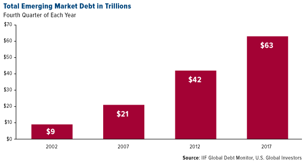 Exacerbating all of this is historically high levels of debt. Debt in emerging markets stood at $63 trillion in 2017, up sevenfold from 2002 levels, according to the Institute of International Finance (IIF). And as I said earlier, higher U.S. interest rates make servicing this debt more expensive.