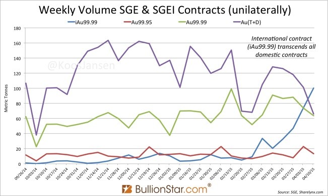 In September 2014 the Shanghai Gold Exchange (SGE) launched its International Board, the Shanghai International Gold Exchange (SGEI). After a slow start, the volume of the physical SGEI kilobar contract (iAu99.99) has transcended all other SGE contracts in week 15 (April 6- 10).
