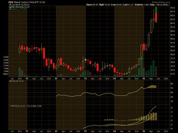 PEK is considered by several Asian market pundits as the bellwether for China stocks. And although this ETF did NOT exist before 2011, its price has soared 151% during the past 13 months. Moreover, the Technical Indicators of RSI and MACD are grossly maxed out…suggesting a material correction looms on the horizon. See chart below: