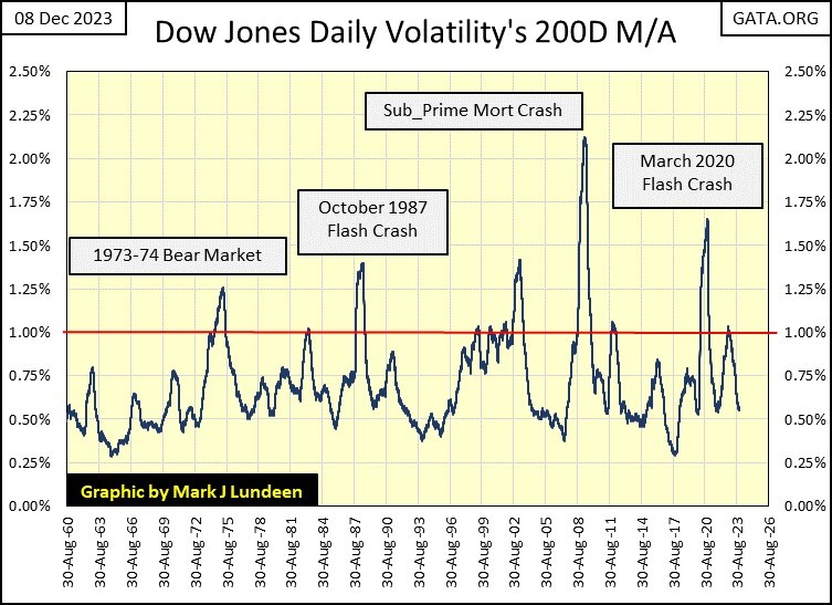 In the chart above, seeing today’s Dow Jones daily volatility’s 200D M/A at 0.55%, marks this market as a market top. So, get out of the stock market, and stay out until once again daily volatility for the Dow Jones spikes, as it always does during a big-bear market decline. When this pending bear market spike in the 200D M/A peaks, and then begins declining towards the 1.00% line, the bottom is in, and the bull market is on. That is the time to jump into the stock market with both feet!