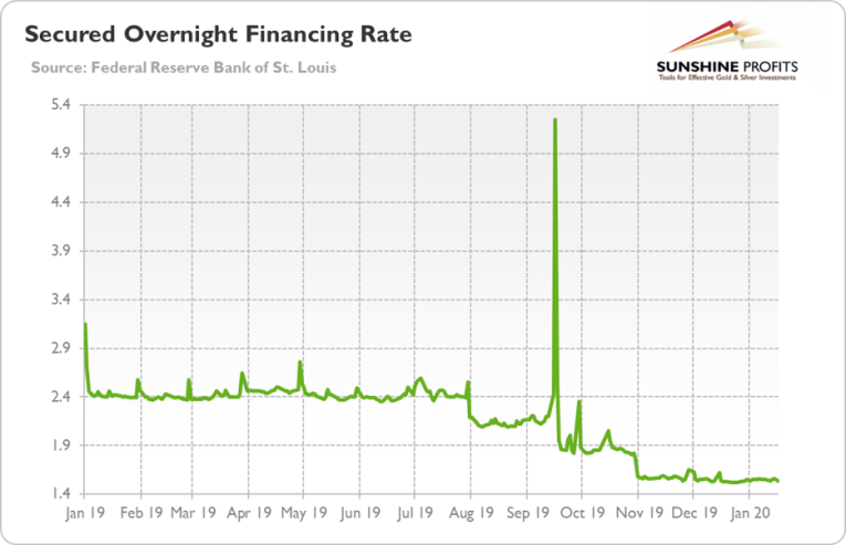 But why we are writing about some obscure market at all? Well, a repo transaction is a short-term agreement to sell securities in order to buy them back at a slightly higher price. Or, effectively, it is a short-term (usually overnight) collateralized loan, in which the borrower sells a security (typically Treasuries) to the lender, with a commitment to buy it back later for the original price plus interest. So, the repo market is an important part of the financial market that redistributes liquidity between financial institutions, providing funds for those who need them. With daily turnover of about $1 trillion, the US repo market’s health is essential for the whole financial market to operate smoothly. Any disruption in this market could be fatal for other financial market segments and ultimately for the global economy. We are not exaggerating – the financial crisis of 2007-8 and the resulting Great Recession stemmed from a run on the repo market. Hence, the precious metals investors should be vitally interested in the ongoing repo crisis.