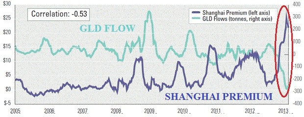 Arbitrage of Shanghai gold contract versus New York gold price: Actually a very intriguing statistic has popped up. Over the last 18 months, the correlation between the GLD gold outflows and the Shanghai gold price premium has reached about 80%. Such figures are not seen outside the scientific laboratories. Corruption does that. The finger is pointed at the Wall Street banks, which appear to be raiding the GLD gold inventory in obvious outright manner. The suspicion is therefore that New York banks are selling gold to China from GLD inventories. They would sell their mothers' livers.