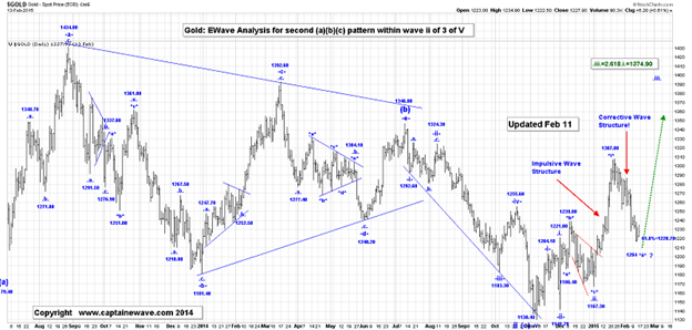 Since we are in an ending diagonal triangle, the legs of this triangle need to consist of at least one 3 wave pattern. If wave $iv$ ended at yesterday’s high of 1236.40, then we should be able to see such a pattern. It does appear that gold has fallen in at least one 3 wave pattern from 1236.40 to the current low of about $1205.