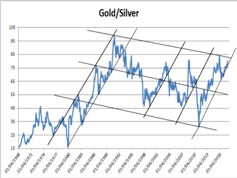 The ratio hit a high of 98.6 in February 1991. After a deep and volatile correction, it again broke above 80 in 2008 and also more recently in 2016, closing last month at 80.16, barely above that level. Of significant technical interest must be the fact that whenever the price of gold outperforms that of silver, the increase in the ratio fits the same steep gradient that has been in place since the 1970s through to today.