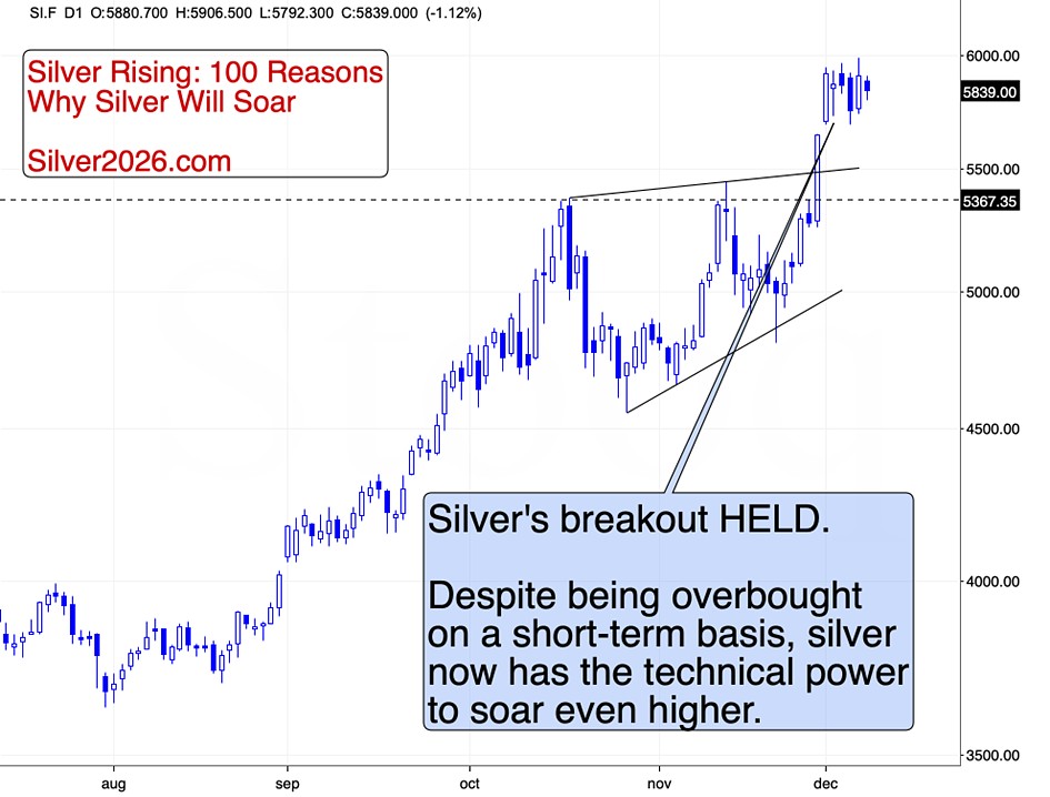 Technically, it looks like a flag pattern, but we’ll know for sure when silver breaks above it (and the $60 level).
