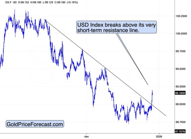 The USD Index broke above its declining resistance line, and this might have marked the end of the short-term decline and the beginning of a much bigger upswing.